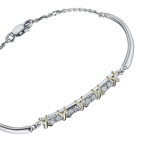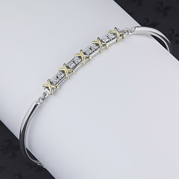 Браслет из комбинированного золота — изысканное украшение для стильного образа. Ненавязчиво демонстрирует ваш статус, материальное благосостояние, хороший вкус. Комбинированное золото надолго сохраняет внешний вид, не боится коррозии. Благородный блеск драгоценного металла и роскошное сверкание бриллиантов не останутся незамеченными. Это именно тот штрих, которого не хватает деловому костюму или вечернему платью.
