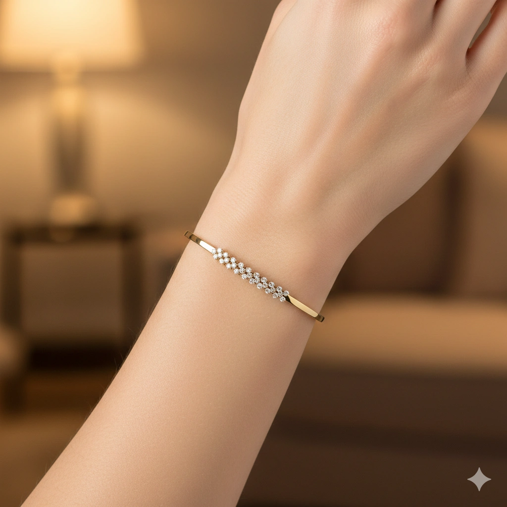 Браслет весит 6.36 граммов, имеет пробу 585, сертификационную бирку, продается в фирменной черной коробочке. Доступная цена, всего 897 000 ₸, от производителя «ЭПЛ Даймонд». Вставка — бриллианты высокой чистоты и прозрачности, без изъянов. Проверить качество камней вы можете в любой геммологической лаборатории.