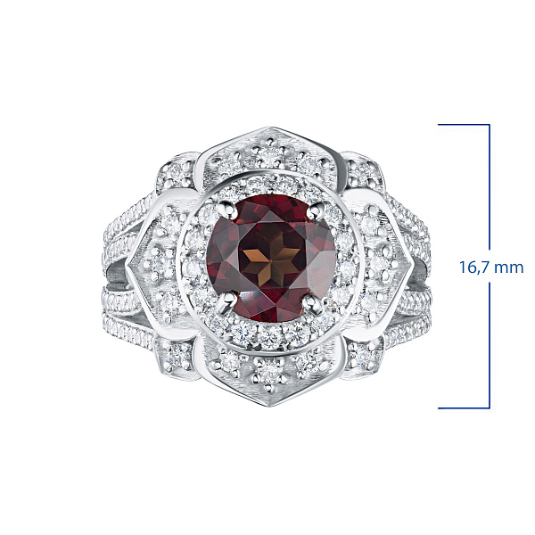 Кольцо из белого золота с бриллиантами и гранатом — эксклюзивное украшение компании «ЭПЛ Даймонд». Это идеальный подарок для близкого человека, возможность продемонстрировать свой статус, хороший вкус. В изделии используются бриллианты высокой чистоты и прозрачности, без изъянов. Белое золото великолепно смотрится на руке, хорошо сочетается с другими украшениями. Соберите свой собственный гарнитур в ювелирном магазине «ЭПЛ»! Вес изделия: 6.86 граммов.