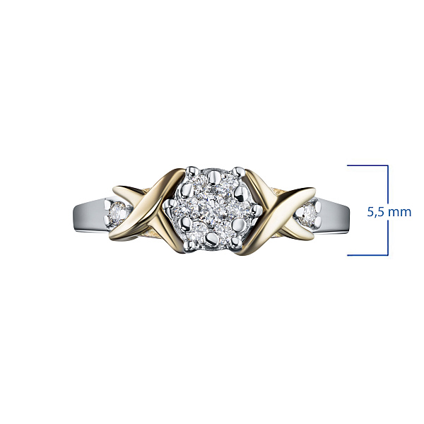 Кольцо из комбинированного золота с бриллиантами — эксклюзивное украшение компании «ЭПЛ Даймонд». Это идеальный подарок для близкого человека, возможность продемонстрировать свой статус, хороший вкус. В изделии используются бриллианты высокой чистоты и прозрачности, без изъянов. Комбинированное золото великолепно смотрится на руке, хорошо сочетается с другими украшениями. Соберите свой собственный гарнитур в ювелирном магазине «ЭПЛ»! Вес изделия: 3.53 грамма.