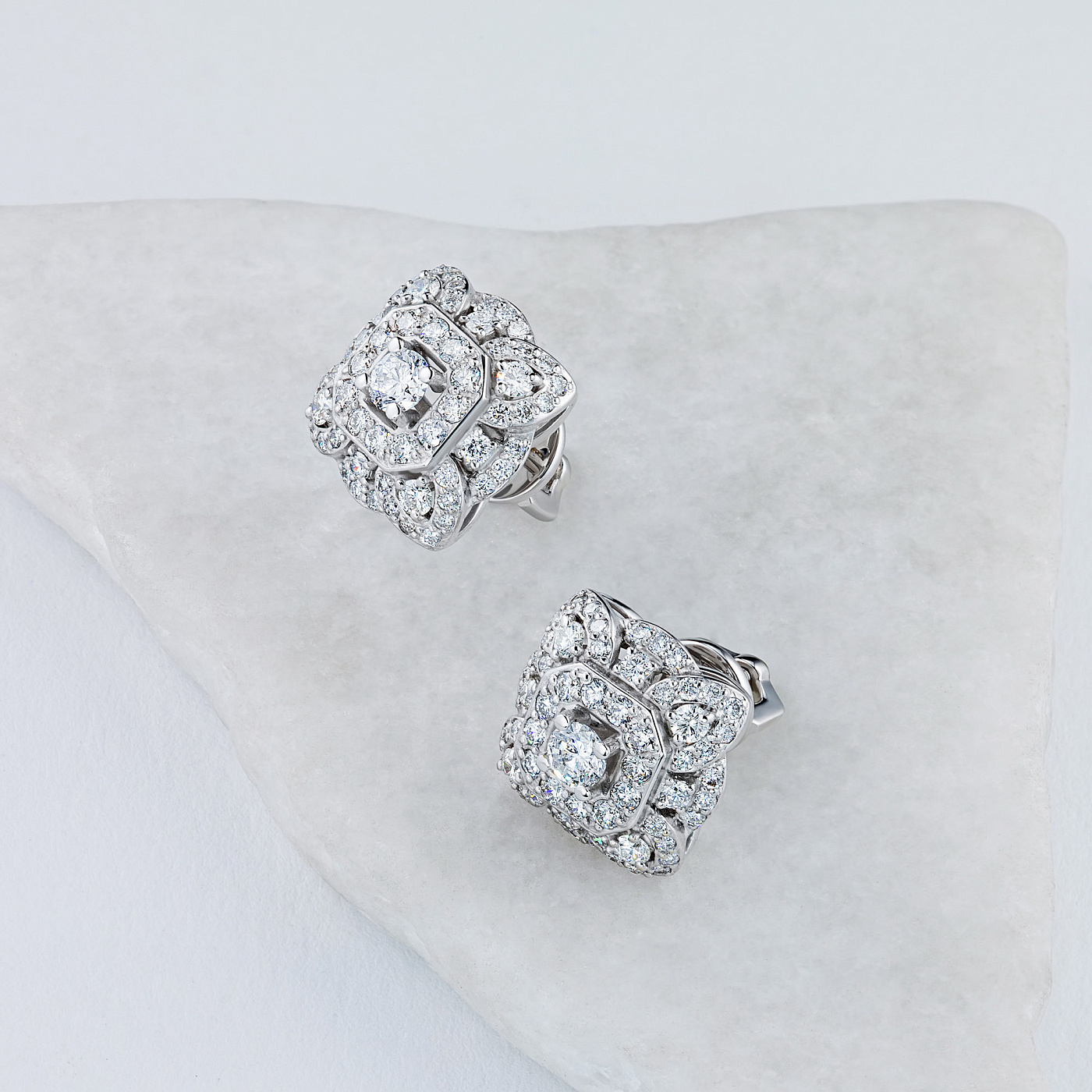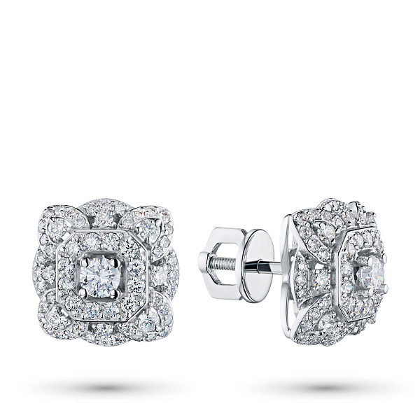 Пусеты из белого золота — великолепное пополнение вашей коллекции украшений. Белое золото подчеркивает игру света на алмазных гранях, не боится влаги, подходит для повседневного ношения. Наши товары реализуются только в фирменных салонах.