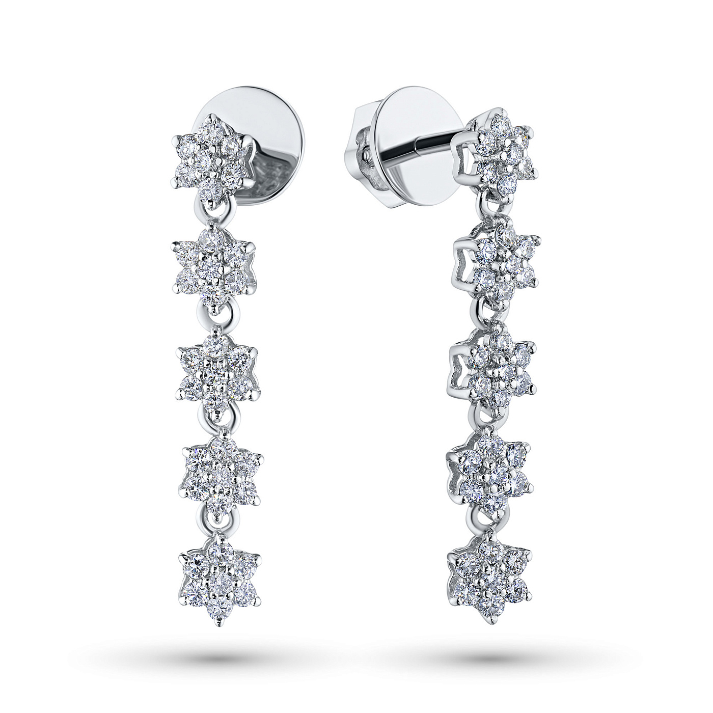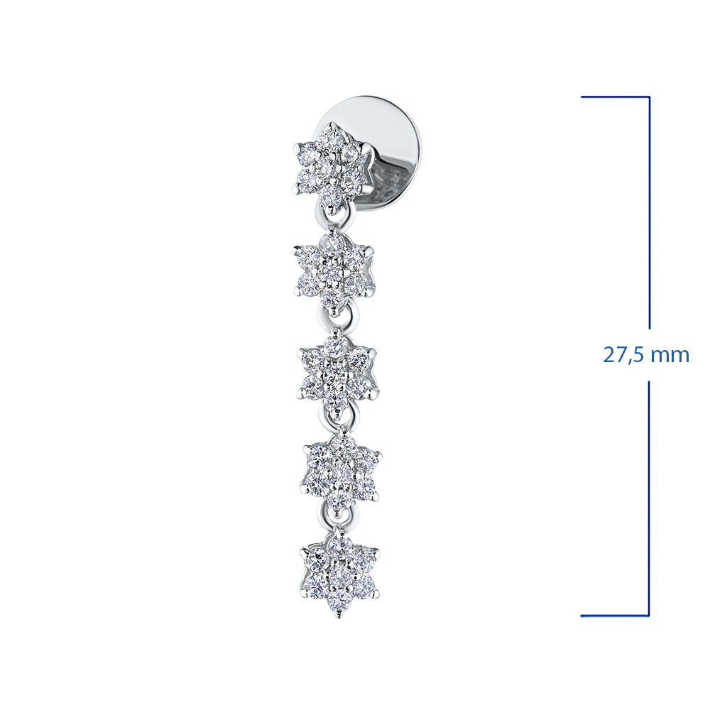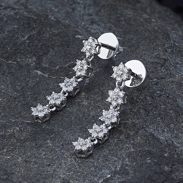 Пусеты из белого золота — великолепное пополнение вашей коллекции украшений. Белое золото подчеркивает игру света на алмазных гранях, не боится влаги, подходит для повседневного ношения. Наши товары реализуются только в фирменных салонах.