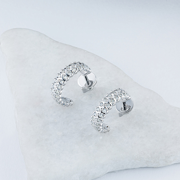 Пусеты из белого золота — великолепное пополнение вашей коллекции украшений. Белое золото подчеркивает игру света на алмазных гранях, не боится влаги, подходит для повседневного ношения. Наши товары реализуются только в фирменных салонах.
